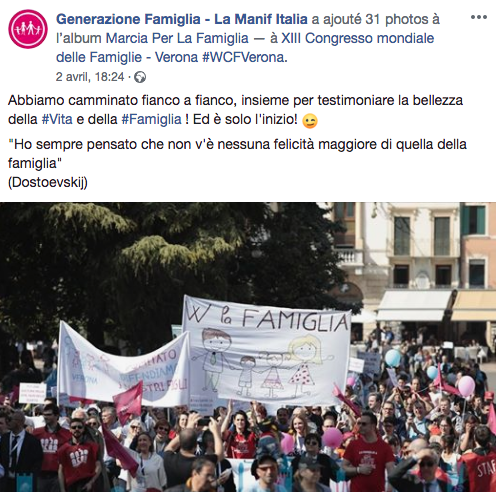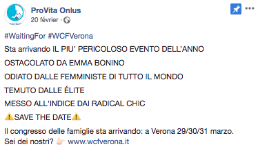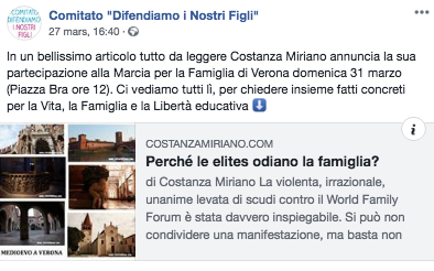Tra il 29 e 31 marzo 2019 si è svolta a Verona la tredicesima edizione del Congresso Mondiale delle Famiglie. Le polemiche che hanno accompagnato la manifestazione sono state numerose e il dibattito tra gli esponenti politici ha quasi monopolizzato l’informazione italiana per un intero fine settimana. [Se volete un approfondimento sulle origini e le evoluzioni del Congresso vi consiglio questo articolo di Giulia Siviero].