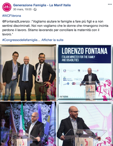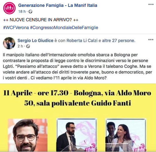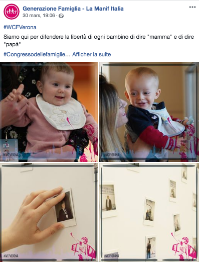Nelle due immagini qui proposte si presenta la questione del Congresso nella tipica situazione del “Noi contro Loro”, in cui il “Noi” combatte per i diritti e le libertà, mentre il “Loro” vuole intrappolare gli individui in una società distopica. Se da una parte questo meccanismo serve a rinforzare il senso di appartenenza, creando una divisione netta e percepibile, dall’altro ha lo scopo di ribaltare la narrazione classica. Come già ripetuto, non sono loro quelli contro, ma sempre gli altri. In questo caso addirittura i detrattori “Odiano la famiglia”, una frase che risulterebbe fastidiosa per chiunque.