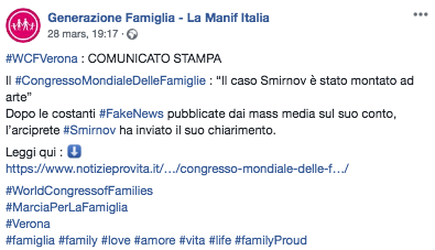 Prima di partire con l’analisi vera e propria va sottolineata una stranezza che ho riscontrato analizzando le pagine Facebook di alcune delle organizzazioni che hanno messo in piedi l’evento: Generazione Famiglia e ProVita hanno avuto e continuano ad avere lo stesso calendario editoriale della pagina ufficiale dell’evento. In pratica condividono gli stessi materiali (foto, video, notizie) negli stessi giorni e nelle stesse ore. Un comportamento alquanto bizzarro, probabilmente causato dal fatto di avere la stessa persona o la stessa agenzia a gestire tutte le pagine, soprattutto considerando che probabilmente molte persone seguano tutte e tre le pagine. In questo modo molti utenti si ritrovano contemporaneamente lo stesso contenuto riproposto nella stessa maniera. Si sarebbe potuto tentare di diversificare i messaggi, analizzando le sotto-nicchie presenti in ogni pagina, ma si è preferito bombardare i follower con gli stessi messaggi ripetitivi in modo che nessuno perdesse nulla. Dal momento, però, che questo tipo di comunicazione sta continuando anche in questi giorni, a Congresso concluso, mi fa più semplicemente pensare ad una mancanza di strategia.